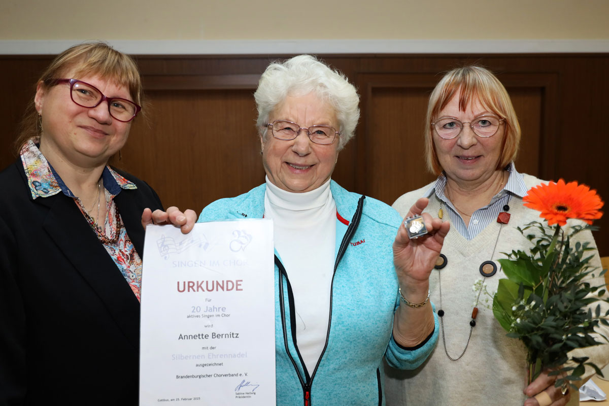 Für 20-jähriges Singen im Chor wurde Annette Bernitz mit der Ehrennadel des Brandenburgischen Chorverbands geehrt. Der Dank für ihre langjährige Arbeit im Ältestenrat ging an Barbara Stoefer und für ihre Tätigkeit als Notenwart an Andrea Bornschein.