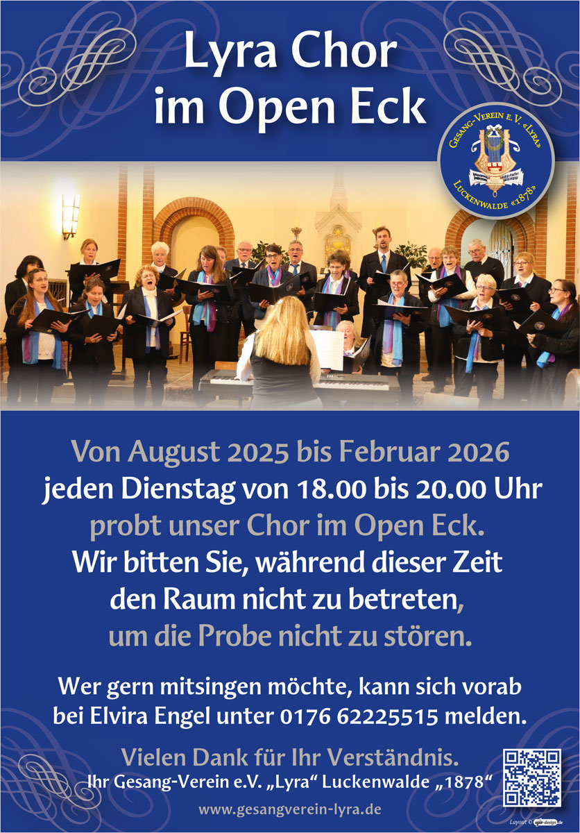 Aufgrund der Renovierungsarbeiten in der Aula des Friedrich-Gymnasiums Luckenwalde werden wir unsere Proben von August 2025 bis voraussichtlich Februar 2026 in den Nachbarschaftstreff Open Eck auf dem Boulevard verlegen.