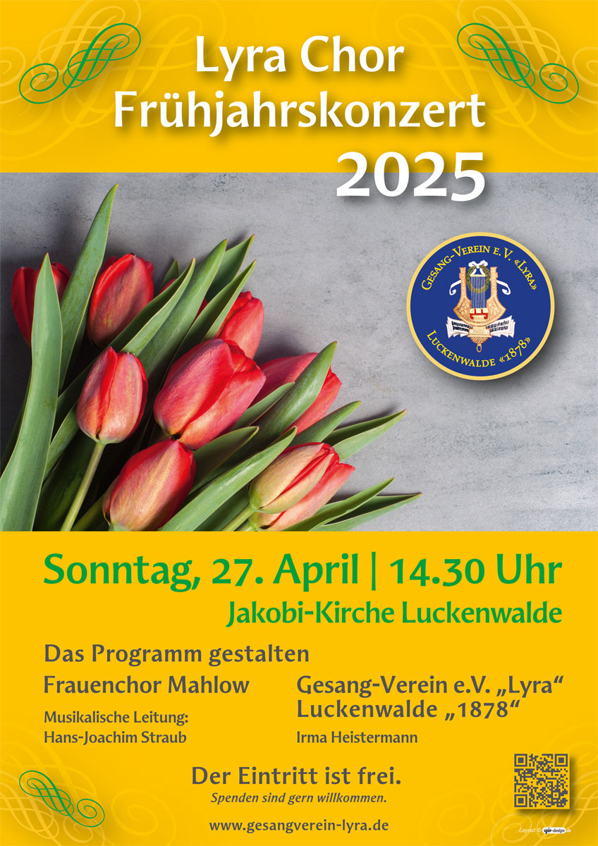Der Gesang-Verein e.V. «LYRA» Luckenwalde «1878» lud in diesem Jahr – statt zum sonst traditionellen Neujahrskonzert – zum Jahresauftaktkonzert 2023 in die Aula des Luckenwalder Friedrich-Gymnasiums ein. Gemeinsam mit Sängerinnen und -sängern aus Jüterbog, Baruth/Mark und Sperenberg brachten wir am Sonntag, dem 19. Februar ein abwechslungsreiches Programm zu Gehör.