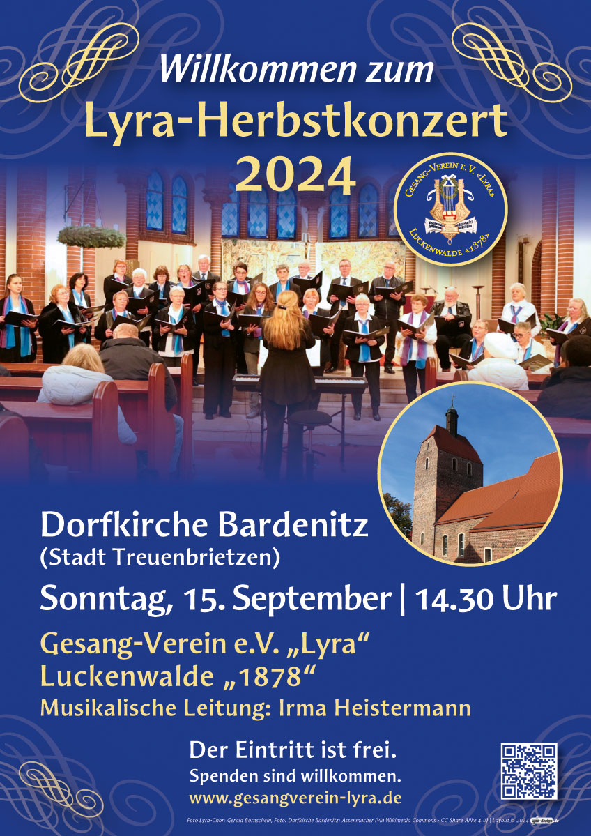 Der Gesang-Verein e.V. «LYRA» Luckenwalde «1878» hatte am Sonntag, dem 15. September zum Herbstkonzert 2024 in die Dorfkirche Bardenitz (Stadt Treuenbrietzen) geladen. Mit einem abwechslungsreichen Programm von klassischem bis modernen Liedgut verabschiedeten wir den Sommer. Das Wetter spielte zum Glück noch gut mit.