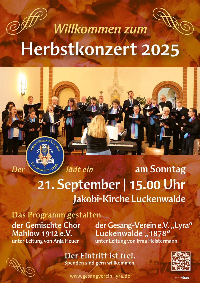 Unser Gesang-Verein lädt alle Freunde des Chorgesangs am Sonntag, 21. September ab 15.00 Uhr zum Herbstkonzert in die Luckenwalder Jakobikirche ein.